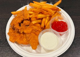 Four strips served with ranch dipping sauce.